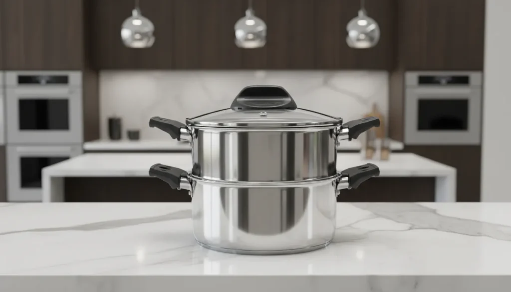 O aço inox, especialmente com fundo triplo, distribui o calor de maneira uniforme, reduzindo pontos frios onde o vapor poderia condensar. Isso garante menos acúmulo de água e mais eficiência no preparo dos alimentos.